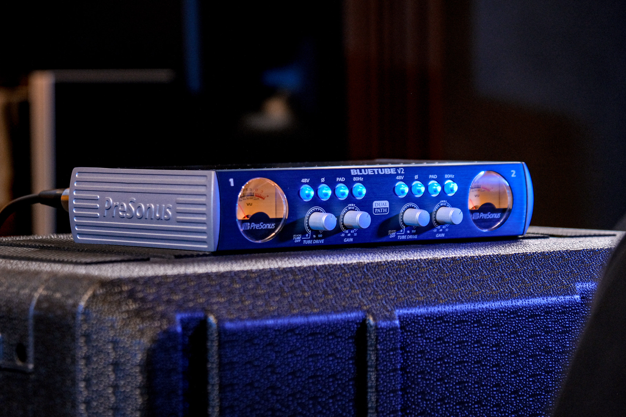 BlueTube DP V2 – preamp 2 kênh với đường tín hiệu solid-state + ống 12AX7, hỗ trợ mic/instrument, mang lại âm sắc ấm và chân thật.