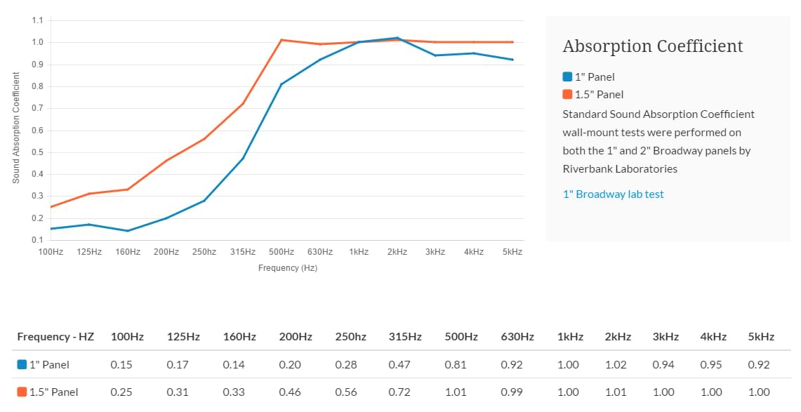 Các tấm Broadway được làm từ sợi thủy tinh mật độ cao 6lb trên mỗi foot khối (96 kg / m³), mang lại khả năng hấp thụ cao hơn gần năm lần so với các giải pháp thay thế bọt giá rẻ điển hình. Điều này có nghĩa là bạn nhận được nhiều sự hấp thụ hơn với ít tấm nền hơn, đồng thời đảm bảo một đường cong hấp thụ đồng đều trong toàn bộ dải tần. Bộ đồ dùng phòng London 8 có màu đen, màu be hoặc vải màu xám hoặc sơn hoàn thiện màu trắng tuyệt đối ™.